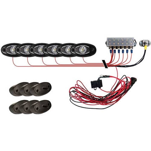 The rock light kit combines the high powered durable a series led lighting with custom 15 leads on each light a distribution block switch and angled mounts to light up any truck jeep or all terrain vehicle.